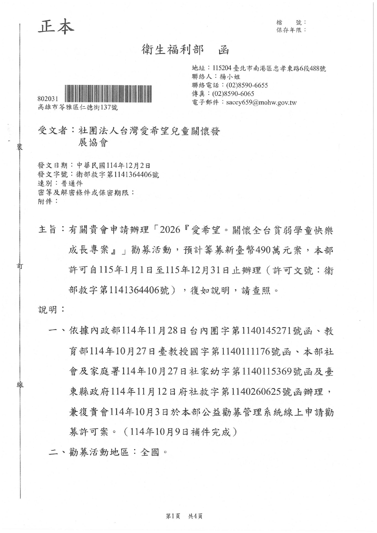 本會名稱為社團法人台灣愛希望兒童關懷發展協會(以下簡稱本會)。