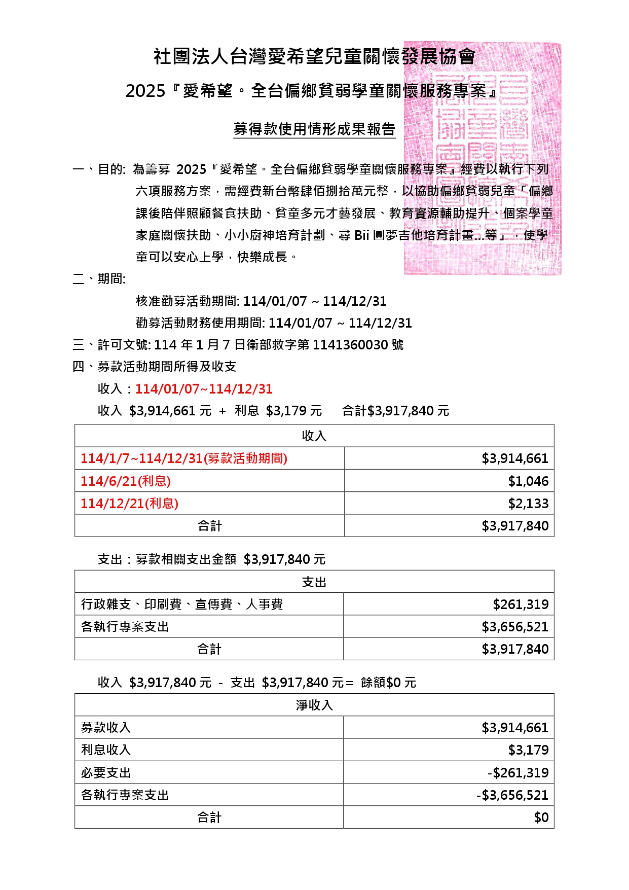 2025『愛希望。全台偏鄉貧弱學童關懷服務專案』1-12月使用情形