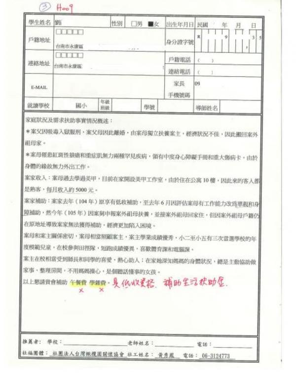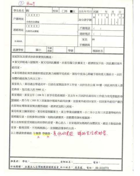 台南永康區 劉同學 個案協助
