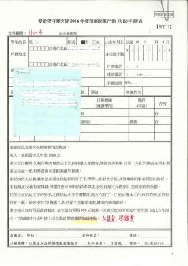 就讀台南市北區博愛國小 吳同學,案主父母離異,扶養權歸案父,案父在一間燒肉便當店工作,因為之前替別人擔保,導致負債累累,目前一人在外獨居,並未與案主同住,有時還會回家跟案主祖母要錢。