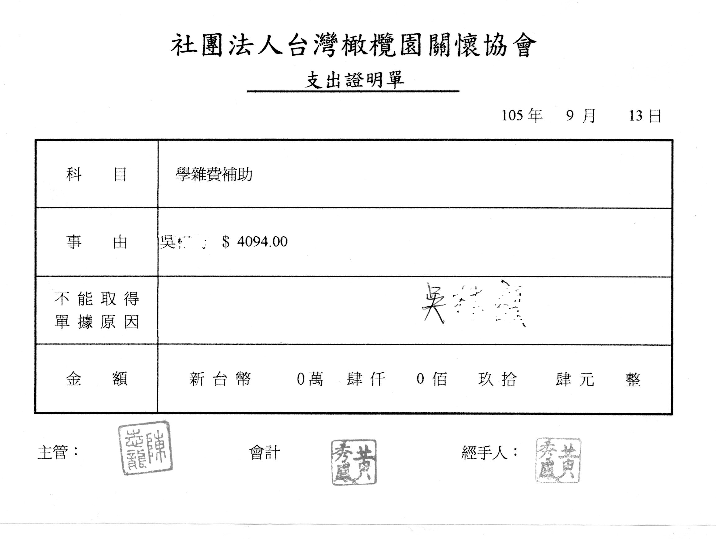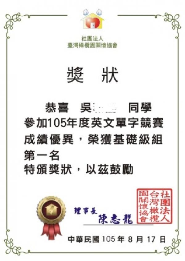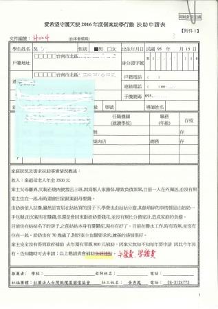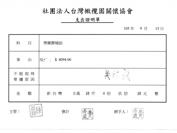 並於 105年9月 透過台南橄欖園關懷協會的執行,發放補助給孩子們繳交給學校。