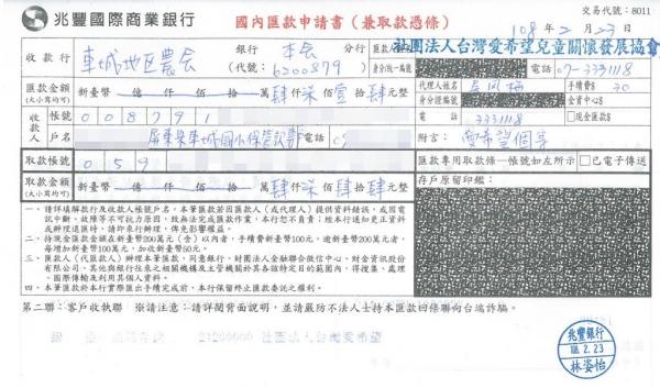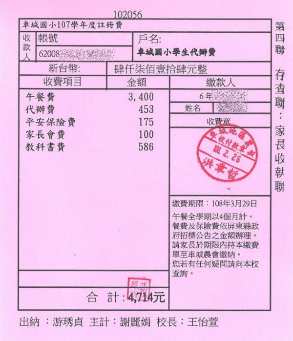 二月份核定扶助 屏東縣車城國小 楊同學學期初助學金全額輔助