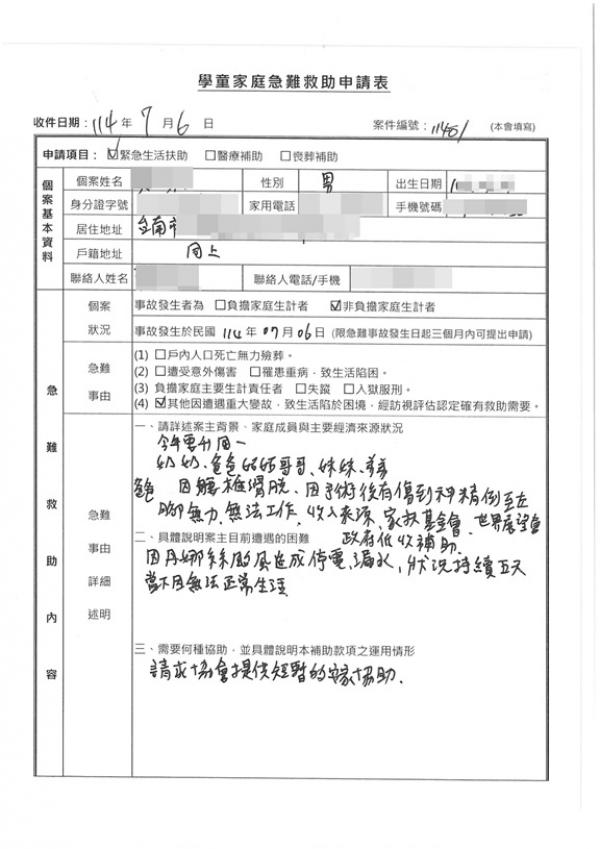 核定補助項目: 急難救助金新台幣肆仟捌佰元整(台南飯店三天兩夜住宿費)。並已於7月8日完成撥款。