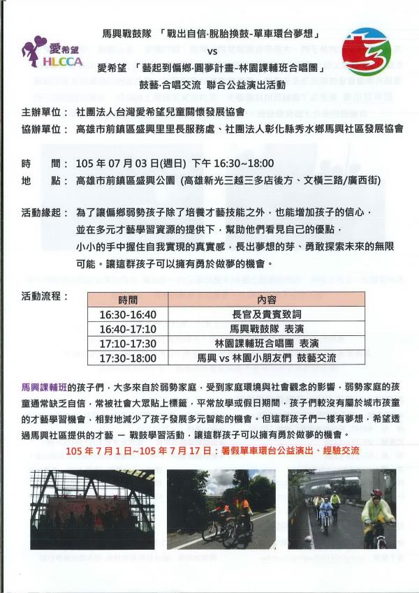 105年7月1日~105年7月17日:暑假單車環台公益演出、經驗交流