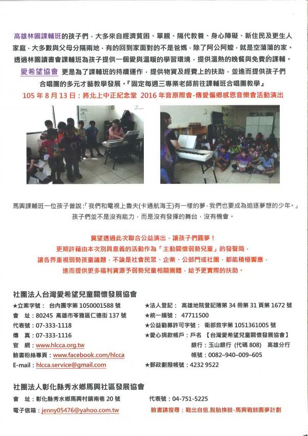 105年8月13日:將北上中正紀念堂 2016年音原際會-傳愛偏鄉感恩音樂會活動演出