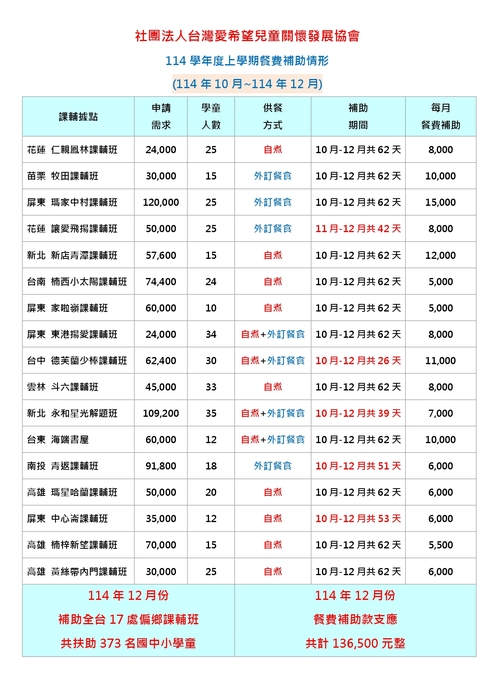 【偏鄉弱勢兒童課輔班-營養餐費扶助計畫】2025年12月份執行成果